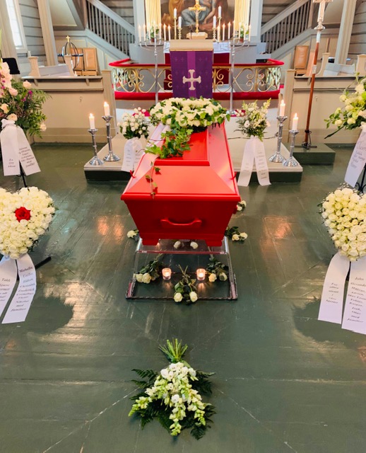 Mamma elsket innslag av rødt i klesveien eller accessoirer og hun gikk ikke ut uten den røde leppestiften – ikke engang i postkassen. Det var derfor helt naturlig å velge Ferrarirød kiste. Vi valgte hvite blomster og kledde oss i hvite kjoler – som en hyllest til livet – med innslag av rødt og med rød leppestift, samt at vi barna selv holdt en personlig minnetale for vår kjære mamma. Begravelsen ble nær og kjær, et nydelig minne og helt perfekt – mamma hadde elsket det! ❤