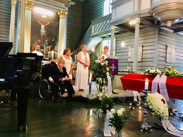 Mamma var en person som likte struktur, orden og planlegging. Så også sin egen begravelse. Hun hadde spart penger i flere år på egen konto avsatt til sin begravelse, og vi hadde fått klare instrukser om hvordan hun ville ha det. Vi skulle ikke sørge, men hylle livet og minnes henne med glede, fikk vi beskjed om. Hennes drøm om sin egen begravelse var en «New Orleans» – inspirert seanse med hennes favorittmusikk, salsa og Tina Turner, der vi «danset, klappet og sang» ut av kirken etter hennes båre. Sånn forsøkte vi å få det til også. Vi valgte piano og saksofon med live fremføring av Crazy (Julio Iglesias), Simply The Best (Tina Turner, som var mammas favoritt:), Despacito (Luis Fonsi) og utgang med Volare (Gipsy Kings) i godt driv.